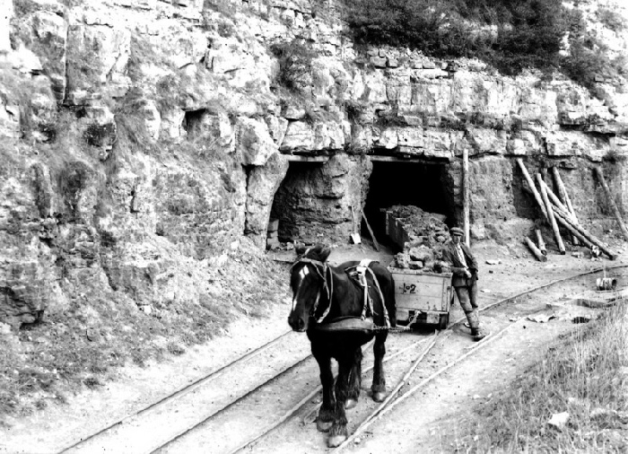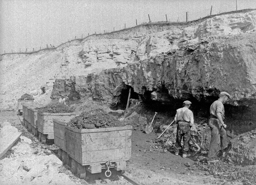 Long Harry Mine, Mid Lincoln Ironstone Mines, Greetwell. Looking N. Lincolnshire Limestone overlying Northampton Ironstone, Greetwell. The picture shows men working out the ironstone at the quarry-face, Long Harry Mine.