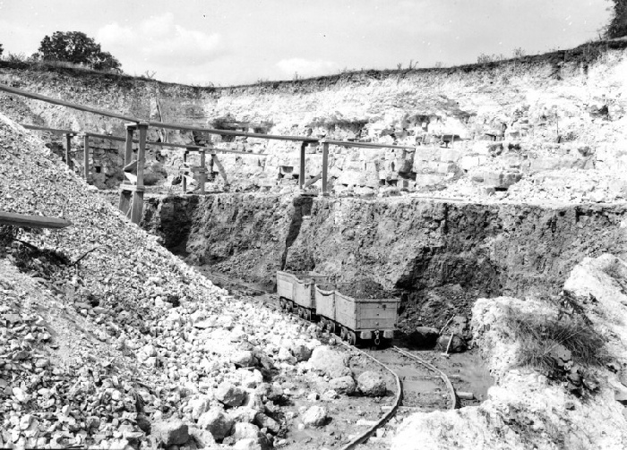 Looking N. Lincolnshire Limestone overlying Northampton Ironstone, Greetwell. Similar section to last (P206247). Trucks leaving the Long Harry Mine, laden with ironstone.