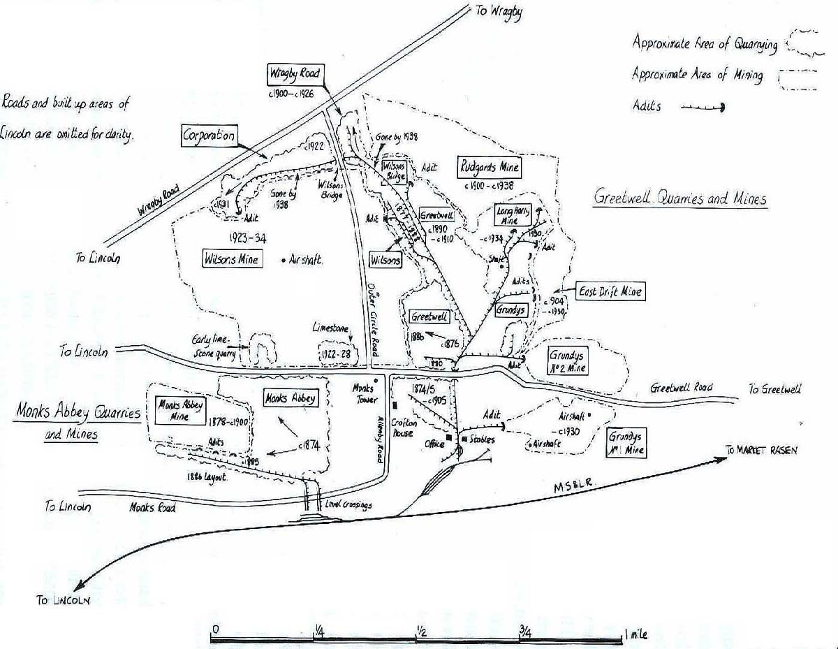 Greetwell Ironstone Mines 1870-1945: A map of the system abstracted from Eric Tonks’ work, with Thanks & appreciation.
