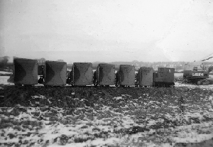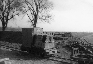 I had an early acquaintence with the lines at Burton Gravel Pits, but there were other lines in the the Lincoln Area proper. Many readers of pages like this are aware of the use made of narrow gauge railways by organisations such as Anglian Water Board and their predecessors. In the mid-winter of 1967/68 the 'Lincolnshire River Board' carried out extensive culvert work on the A57 (Saxilby Road) in Lincoln. A 'catchwater' runs underground between Long Leys Road and the West Common (except when it rains and the water flows on the surface. Ed.), until the road turns away to the right. The drain then flows in a deep ditch at the Common side, until it reaches the 'Straight Mile' and A57 which it passes under in a culvert, before becoming a 'big river' and flowing into the Fosse. As part of work where it passes under the 'Straight Mile' and adjacent to it a 10RB excavator was brought into, together with a locomotive, and a number of side tips. By elimination the locomotive was a Ruston & Hornsby 4wDM, either 421432 or 433 of 1959. (Not so. TJH 12/2005: The locomotive was Ruston & Hornsby 13DL 224311/1943). The line was short lived and no trace remains: I visited it on at least one occasion and took photographs.
