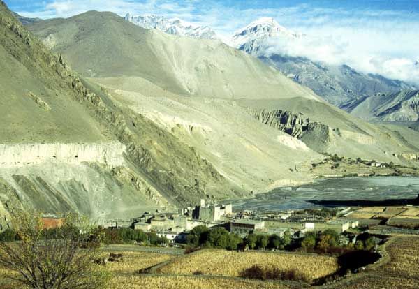 Walking through the gorge we climb steadily until, suddenly, the gorge opens into a wide flat bottomed valley. Here is no raging torrent but a river running gently in braided streams which we cross on stones or simple plank bridges. The vegetation changes, too, becoming more and more alpine, until, in the upper valley all that grows naturally are a few sparse grasses. Walking on gravel flats we reach the ancient walled town of Kagbeni where we gaze upriver to the forbidden land of Mustang. This is not the Nepal that we know, but rather a harsh, barren tableland akin to Tibet, and we know that unhappy country lies only a few short, but impossible miles to the north. Leaving the river we turn uphill to Muktinath. As we climb the broad, dusty trail we may see sadhus, scantily clad despite lingering snows, their eyes shining with the prospects of reaching the summit of their pilgrimage. These last few days of walking are days of wonder for all who trek here with eyes to see the riches of this remote world. We look beyond the aridity, beyond the parched hills and cliffs of erosion, and glory in this still-evolving, still-growing land. As we wander we absorb its magic and mystery.