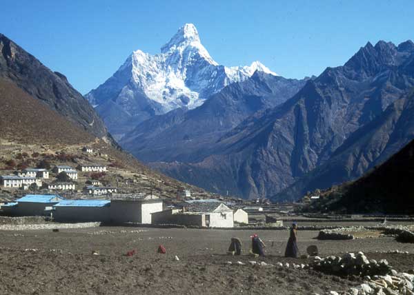 'Let us suggest just a few of the highlights: the beautiful mountain of Ama Dablam rising above the Imja Khola - the Sherpa villages of the high valleys of Khumbu - views of Cho Oyu and Gyachung Kang from the Ngozumpa glacier - Gokyo Ri with its spectacular view of Mount Everest, one of the most wonderful panoramas in Himalaya - an easy pass of over 18,000ft leading to the heart of Khumbu - Everest Base Camp and high camps by the Khumbu Glacier with close up views of Mount Everest, Lhotse, Nuptse, Pumori and Ama Dablam... In the autumn months after the monsoon the weather is usually perfect - warm sunny days with a brilliant blue sky against which the high peaks stand in sharp relief. Birches in the forest turn gold and on the higher slopes berberis glows fiery red... the sunsets are breathtaking'.