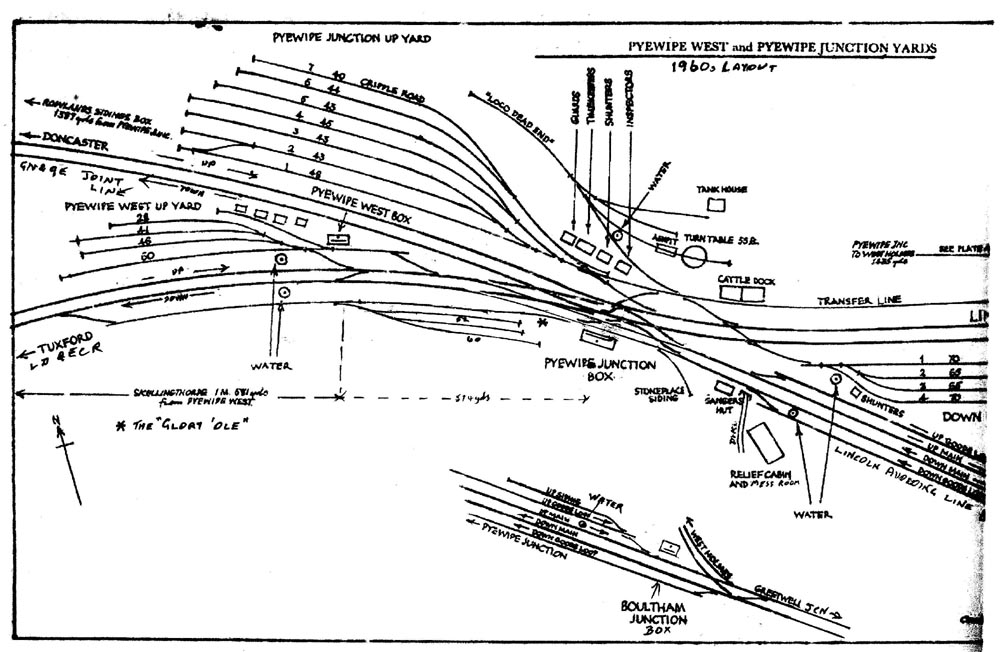 I used to work at Pyewipe many years ago and I found some discrepancies in the track plan. The notations on the up and down LD&ECR to Skellingthorpe and the up and down GN&GE Joint line to Gainsborough Trent Jct were incorrectly reversed, and I’ve also added the tracks showing the full layout before the ‘simplification’ in the late 1960s when Pyewipe West was closed.